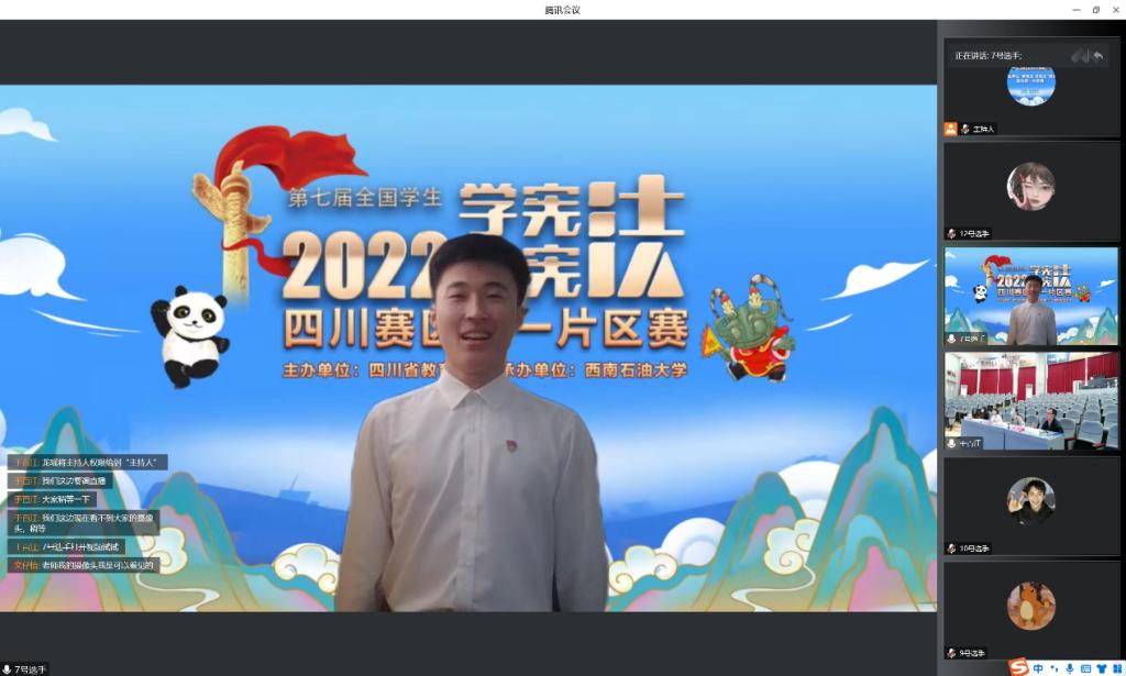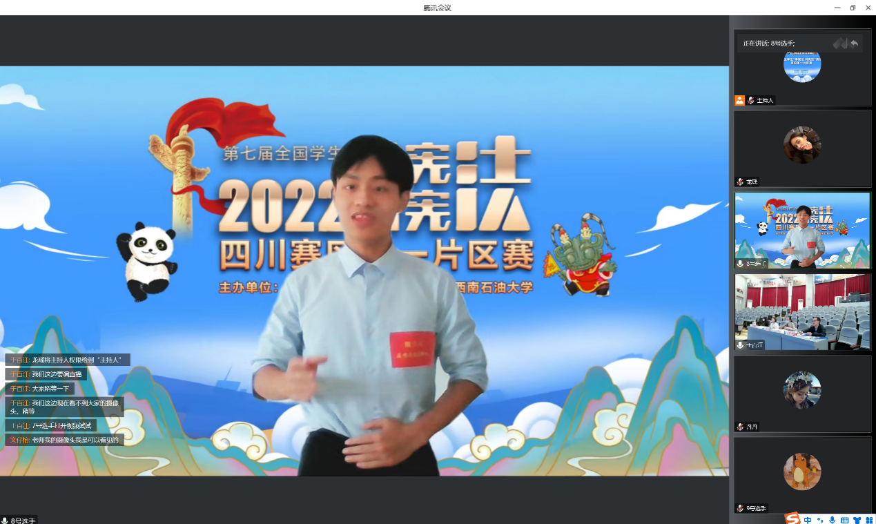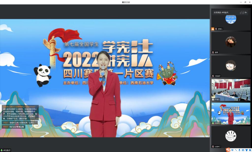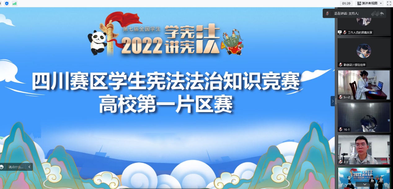 在知識競賽中,16名參賽選手通過雨課堂進行線上答題,賽題聚焦憲法知識,包含了民法典、未成年人保護、預(yù)防未成年人犯罪、職業(yè)教育、勞動教育、安全教育等相關(guān)法治知識。選手們結(jié)合所學(xué)知識認真作答,充分展現(xiàn)了當代青年學(xué)子對憲法的熱愛,體現(xiàn)了廣大學(xué)子維護憲法尊嚴、保證憲法實施的自覺性。經(jīng)過層層激烈角逐,西南石油大學(xué)夏夢遙、西華師范大學(xué)陳櫓宇、四川電影電視學(xué)院朱學(xué)航順利晉級省決賽。