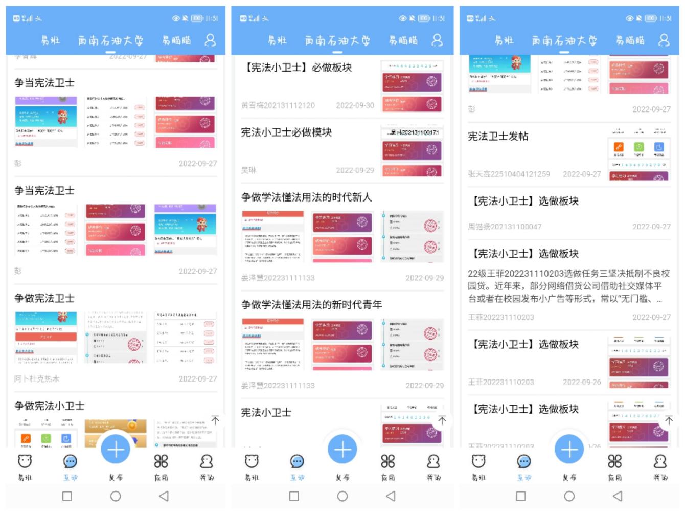 本次活動參與者需要在教育部全國?少年普法?中“憲法活動”的版塊登陸賬號并按照要求完成學習任務,并將積極在易班微社區進行心得分享。同時,活動主辦方也通過創建答疑QQ群的方式,在活動開展過程中及時解答了相關問題,參與同學表現良好,微社區發布內容規范且積極。