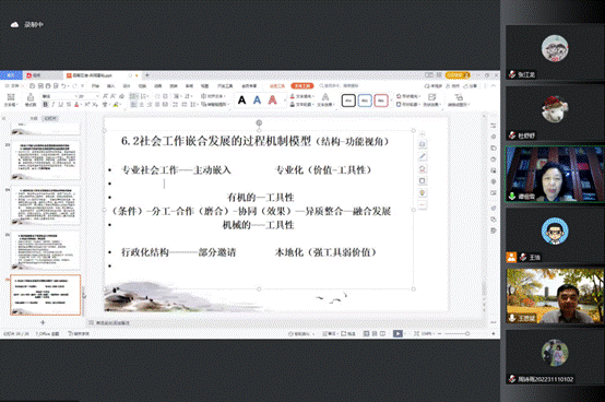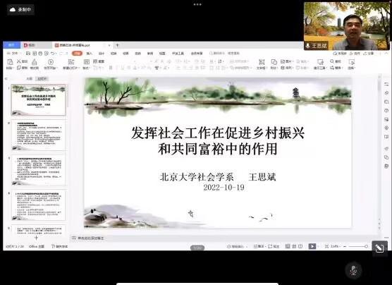 2022年10月19日晚上19:00,中國社會工作學會會長、中國社會工作教育協會名譽會長、民政部全國社會工作者職業水平評價專家委員會常務副主任委員、中國社會學會理事會學術委員會副主任委員、北京大學社會學系教授王思斌應邀為我校師生在“云上”作題為“發揮社會工作在促進鄉村振興和共同富裕中的作用”的講座。法學院副院長譚祖雪、社會工作教研室全體教師、法學院研究生和本科生參加了本次講座,講座由譚祖雪教授主持。