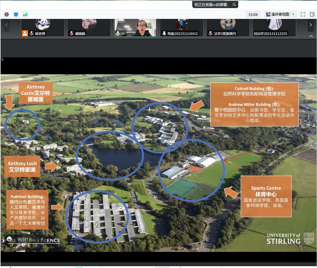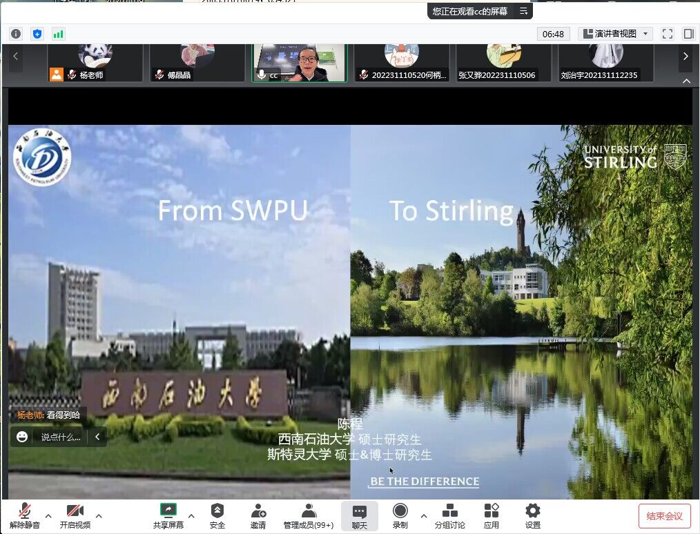 宣講會伊始,陳程博士就自己參加雙碩士聯培“1+1+1”項目的求學經歷展開,就英國斯特林大學的校園環境、教學安排、圖書館氛圍、獎學金申請、住宿環境等方面進行介紹,在此后因個人學術的追求與興趣,進一步在斯特靈大學完成了博士學習,目前即將歸國任教。此番介紹讓同學們對英國斯特靈大學有了極大的興趣。