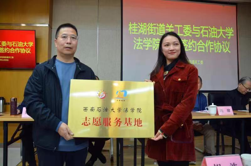 為弘揚社會主義法治精神,引導大學學生在志愿實踐中服務社會、增強本領,法學院精心打造“護航青春”大學生法治志愿服務項目,與新都區桂湖街道關工委共建法治志愿服務基地。2022年11月9日下午,雙方在新都區桂湖街道便民服務中心舉行了簽約及授牌儀式。新都區關工委副秘書長汪健、區關工委副主任譚書倫、余勇、李琳、桂湖街道關工委執行主任徐南貴、常務副主任劉昌力、邱玉忠、黃光耀、法學院團委書記鄧超越參加了本次授牌儀式。