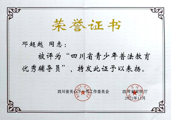 近日,四川省關心下一代工作委員會、四川省司法廳公布了四川省青少年普法教育先進集體、先進個人和優秀輔導員的評選結果。我院輔導員鄧超越榮獲“四川省青少年普法教育優秀輔導員”。