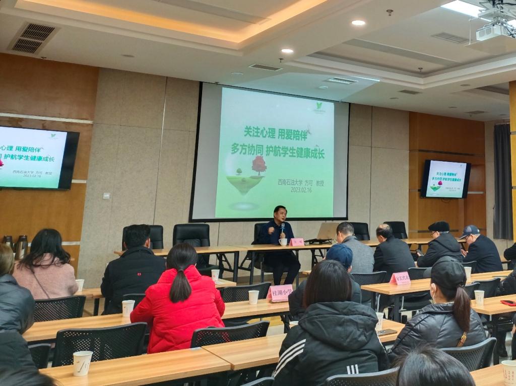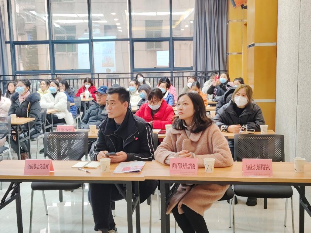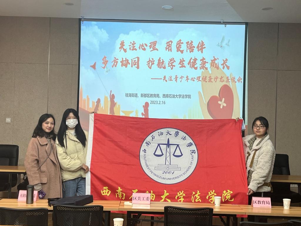 為進一步加強學生心理健康教育,護航青少年兒童健康發展,2023年2月16日,我院與新都區桂湖街道、新都區教育局在桂湖街道便民服務中心共同組織開展了“關注青少年心理健康沙龍座談會”,活動由西南石油大學心理發展與服務中心主任方可教授擔任主講,新都區關工委副主任譚書倫、新都區教育局關工委秘書長陳紹宇、桂湖街道關工委執行主任徐南貴、西南石油大學法學院團委書記鄧超越,桂湖小學校長康平及桂湖小學部分班主任、學生家長代表參加了本次座談會,西南石油大學法律協會的同學們參與了活動的志愿服務。