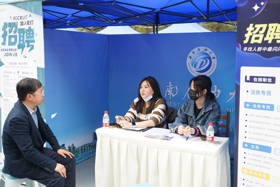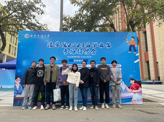 為拓寬就業渠道,提高就業質量,3月15日下午,法學院2023屆畢業生專場招聘會在學校學生活動中心前廣場舉行。學校招生就業處副處長肖友平蒞臨現場進行指導,法學院黨委副書記、紀委書記于百江,院團委書記、學生工作辦公室主任鄧超越,畢業班輔導員楊可瀚,2022級輔導員邵梧梟,兼職輔導員謝瑩嬌等到現場為求職學子加油鼓勁。