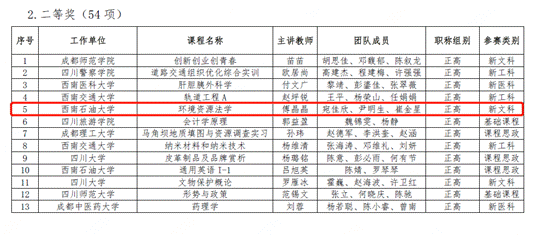 近日,四川省教育廳發(fā)布《關(guān)于第三屆四川省普通本科高校教師教學(xué)創(chuàng)新大賽獲獎(jiǎng)名單的公示》,由法學(xué)院院長傅晶晶教授擔(dān)任負(fù)責(zé)人,宛佳欣博士、尹明生副教授、崔金星副教授作為成員組成的環(huán)境資源法學(xué)課程教學(xué)團(tuán)隊(duì),被評為第三屆四川省普通本科高校教師教學(xué)創(chuàng)新大賽二等獎(jiǎng)。
