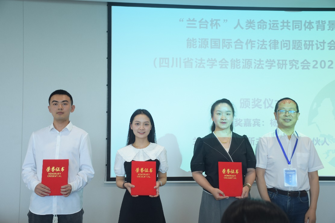 圖15:四川省法學會能源法學研究會副會長,成都高新技術產業開發區人民法院黨組書記、院長何良彬向研討會一等獎獲獎論文作者代表頒發證書