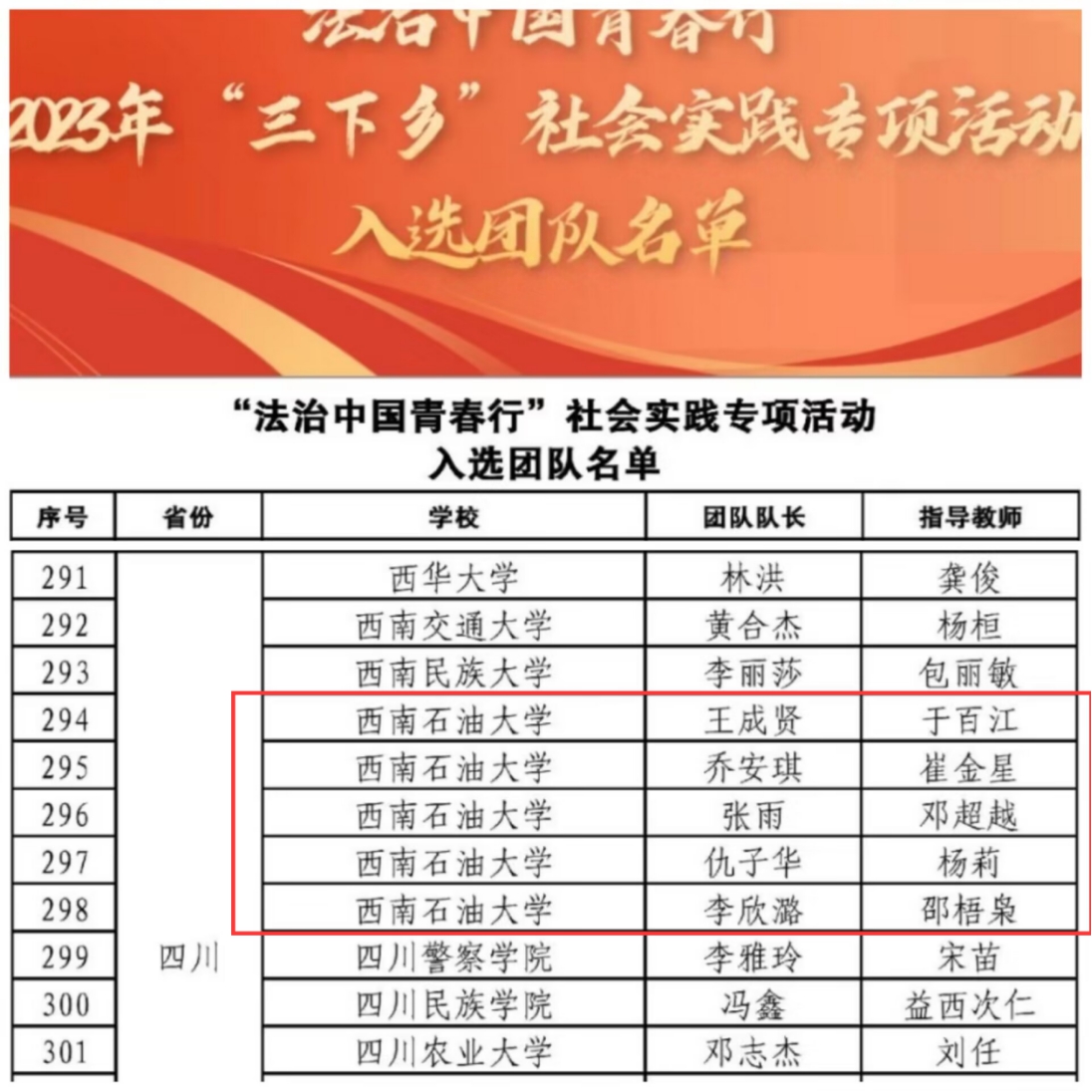 近日,團中央權益部公布了《關于2023年暑期開展的“法治中國青春行”全國大學生暑期社會實踐專項活動入選團隊名單》。經過自愿報名、學校團委推薦、全國政法類高校(學院)共青團工作聯盟審核等環節,最終共有348支團隊入選。其中,我院共5支隊伍入圍,四川僅17支隊伍入選。