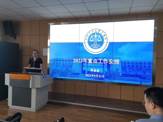 傅晶晶首先通報了學院2023年度已經完成的各項工作情況。其次對2023年秋季學期重點工作從4個方面進行了部署。1、加強政治理論學習和師德師風建設。堅持以習近平新時代中國特色社會主義思想凝心鑄魂,將學習創新理論的成效轉化為推動工作的務實舉措。2、加快推進學科建設。重點圍繞法律碩士、社會工作碩士學位點周期性合格評估和社會工作專業博士學位授權點申報工作開展。3、對標學校“雙一流”中期評估及建設工作。重點圍繞申報國家級課題、建設申報科研平臺、發表學術論文、申報哲社評獎、本碩論文送檢抽檢、國際學術交流等方面開展。4、本科教學工作。重點圍繞國家級一流課程申報、省級教改課題、法學和社會學兩大學科競賽進行布置。