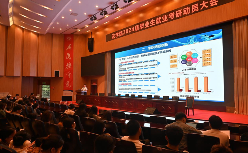 為進一步開展集中性就業指導和考研指導,學院于9月25日上午10:00在圖書館學術報告廳舉行了我院2024屆畢業生的就業考研動員大會,大會主題是“研”途逐夢,“職”爭朝夕。本次大會邀請到校招生就業處副處長肖友平老師和法學院副院長譚祖雪老師做動員和指導,大會由法學院黨委副書記、紀委書記于百江老師主持,法學院畢業班輔導員和畢業生參加了大會。