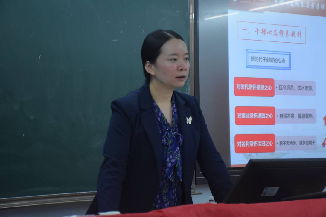 于百江在主持時(shí)指出,本期培訓(xùn)班將圍繞理論學(xué)習(xí)、團(tuán)建活動(dòng)、實(shí)踐鍛煉持續(xù)開展培訓(xùn),全體“青馬”學(xué)員要堅(jiān)定理想信念,做馬克思主義的堅(jiān)定擁護(hù)者;堅(jiān)持知行合一,做馬克思主義的忠實(shí)踐行者和積極傳播者。隨后張老師以兩個(gè)問題為引,引出了“干部心態(tài)修養(yǎng)與素質(zhì)提升”這一主題講座,講座圍繞干部心態(tài)修養(yǎng)提升與干部素質(zhì)能力提升兩個(gè)方面展開。她強(qiáng)調(diào)新時(shí)代干部應(yīng)當(dāng)具備以下好心態(tài):對(duì)時(shí)代常懷感恩之心,對(duì)事業(yè)常懷進(jìn)取之心,對(duì)名利常懷淡泊之心。要想形成和保持好心態(tài),應(yīng)當(dāng)做到:目標(biāo)和定位更清晰一點(diǎn),主要精力能夠再集中一點(diǎn),團(tuán)隊(duì)氛圍溫馨和陽光一點(diǎn)。她特別強(qiáng)調(diào)好干部應(yīng)具備信仰堅(jiān)定、為民服務(wù)、勤政務(wù)實(shí)、敢于擔(dān)當(dāng)和清正廉潔等素質(zhì),并用“忠誠(chéng)”、“干凈”、“擔(dān)當(dāng)”高度概括干部標(biāo)準(zhǔn),希望各位學(xué)員都能以好干部標(biāo)準(zhǔn)嚴(yán)格要求自己。