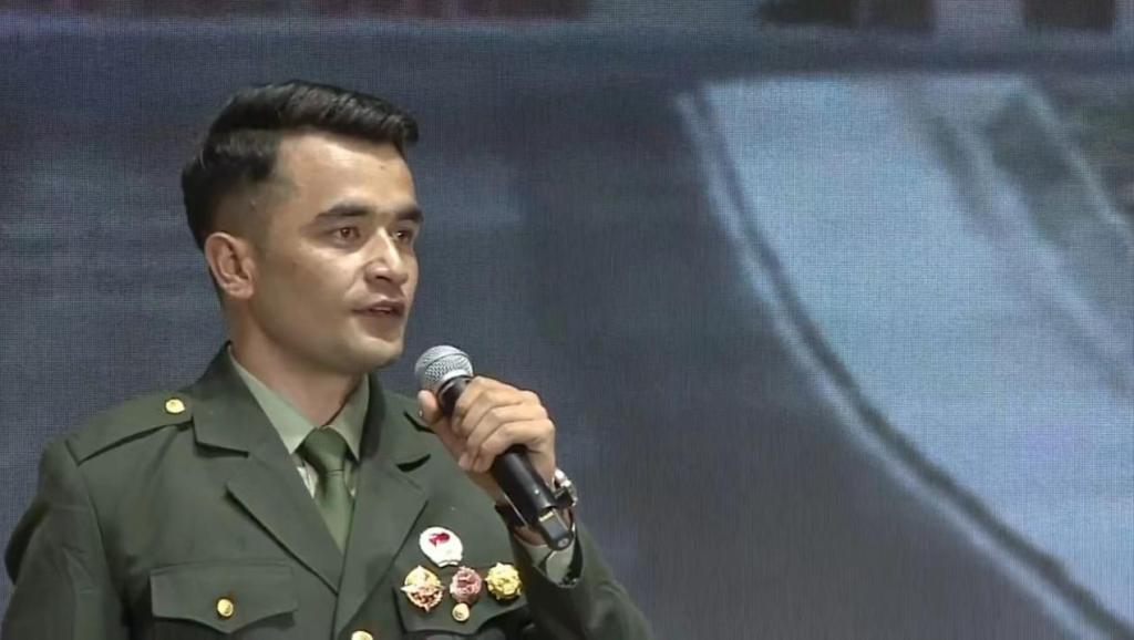 比賽現(xiàn)場(chǎng),依力亞斯·買(mǎi)買(mǎi)提汗以“離星星最近的兵”為題,深情講述了自己從軍戍邊的經(jīng)歷和感悟。受護(hù)邊員母親的影響,依力亞斯從小就有攜筆從戎、衛(wèi)國(guó)戍邊的激情與夢(mèng)想。2021年9月,依力亞斯順利參軍后被分配到新疆軍區(qū)某邊防團(tuán),在英雄團(tuán)長(zhǎng)祁發(fā)寶和四位英雄戰(zhàn)士事跡的激勵(lì)下,他更深刻地理解了邊防軍人的職責(zé)。盡管在喀喇昆侖山脈的嚴(yán)寒中巡邏執(zhí)勤極為艱難,但英雄精神仍激勵(lì)他握緊手中的鋼槍?zhuān)竞妹恳话鄭彙!翱龅囊购莒o,星河仿佛就在頭頂不遠(yuǎn)處,閃閃發(fā)光,每夜陪我一起站崗。冰冷的寒風(fēng)凍傷我裂開(kāi)的臉頰時(shí),我握緊手中的鋼槍?zhuān)抗怙h向了遠(yuǎn)方,當(dāng)我們?cè)谶吔绲膰?guó)土上升起五星紅旗的那一刻,我們就是國(guó)界上最鮮艷的移動(dòng)的界碑!”他飽含愛(ài)國(guó)情的演講引起了在場(chǎng)評(píng)委、觀眾強(qiáng)烈的情感共鳴。
