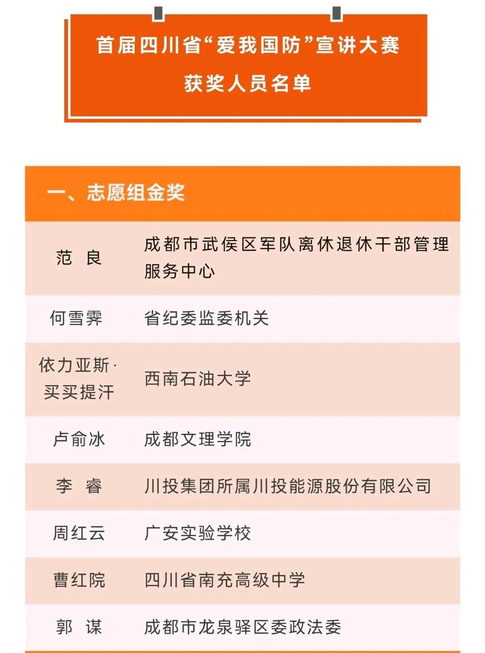 7月8日,首屆四川省“愛我國防”宣講大賽成果展演活動在四川廣播電視臺舉行。活動現場公布了首屆四川省“愛我國防”宣講大賽決賽結果,我院法學專業2022級學生依力亞斯·買買提汗獲得志愿組金獎。今年4月,他參加首屆四川省高校“愛我國防”宣講大賽獲得學生組特等獎。