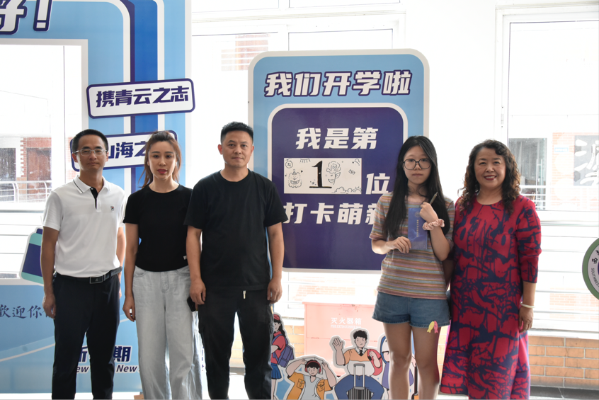 校領導衡彤(右一)與法學院第一位新生及家長合影