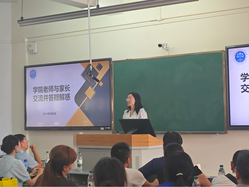 為促進家校共育,建立溝通橋梁,法學院于9月6日下午3點在博學樓B502舉辦了2024級新生家長座談會,出席會議的有法學院黨委書記張華春,法學院黨委副書記、紀委書記于百江,2024級新生輔導員肖丹、楊梓因以及法學院新生家長200余人。