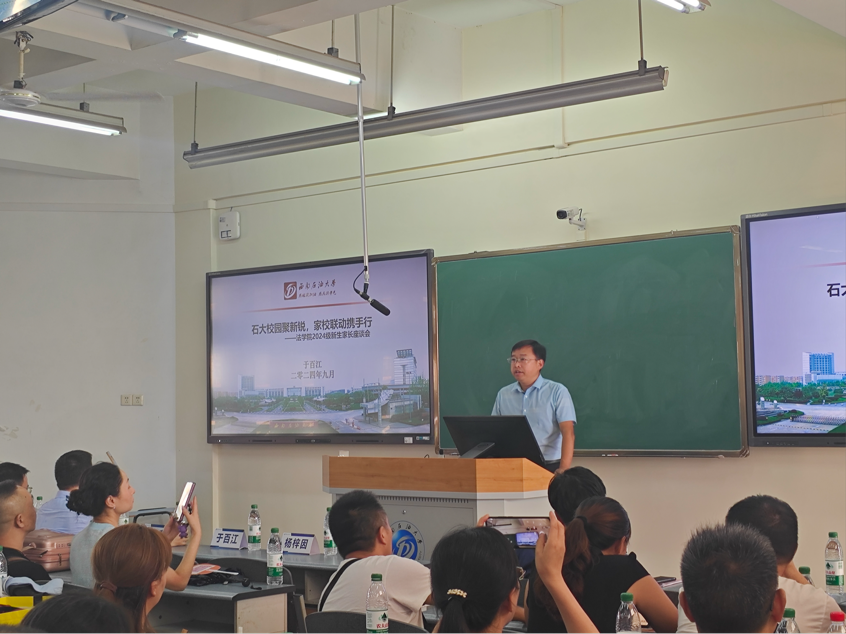 家長會上,張華春代表學院致辭并就法學院的歷史沿革、師資力量、教學科研,學科優(yōu)勢等方面做了介紹,促進了家長對學院的了解。于百江以“石大校園聚新銳,家校聯(lián)動攜手行”為主題介紹了學生工作思路愿景以及教育管理情況。最后與會老師對家長們的咨詢進行了逐一回應。