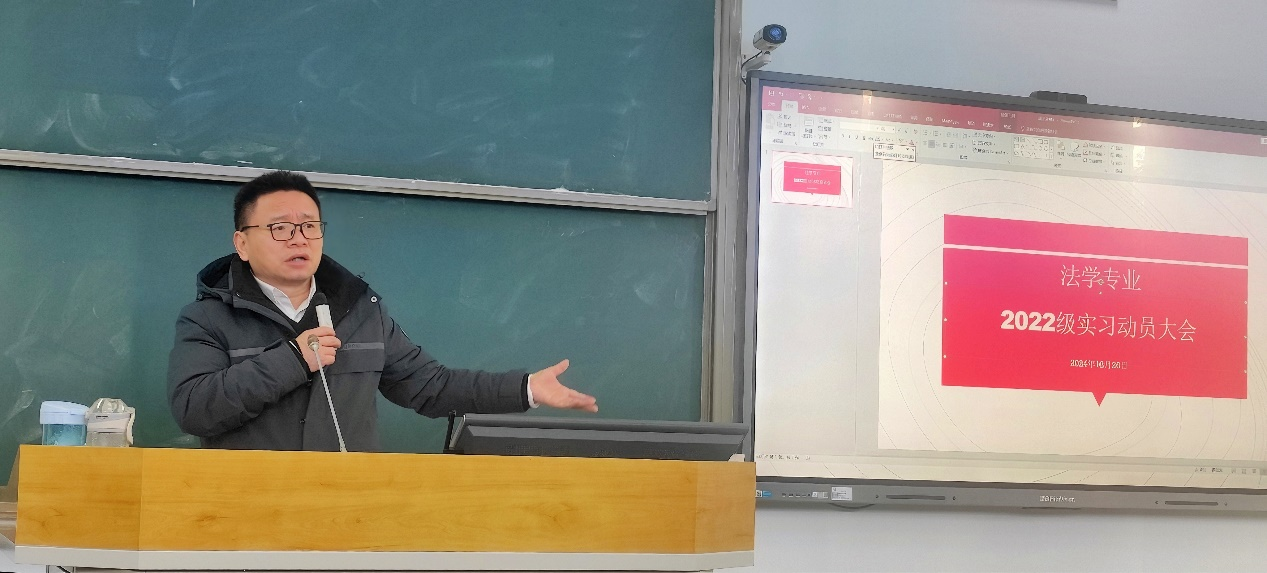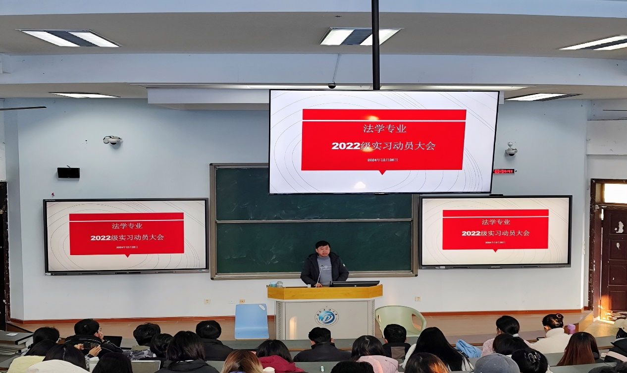 12月26日上午,我院在思學樓C210召開了法學專業2022級實習動員會。參與此次大會的有法學院黨委副書記、紀委書記于百江、法學院實習實訓中心主任宋旭平、2022級輔導員邵梧梟以及2022級法學專業同學。