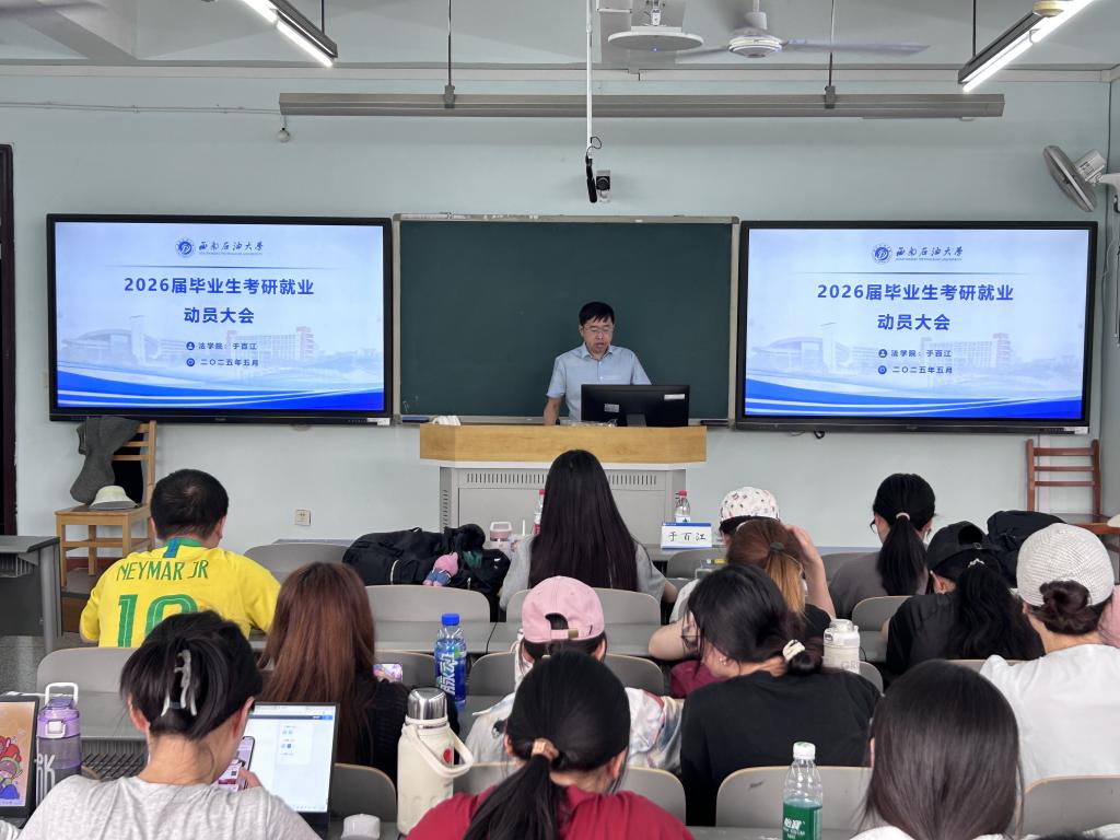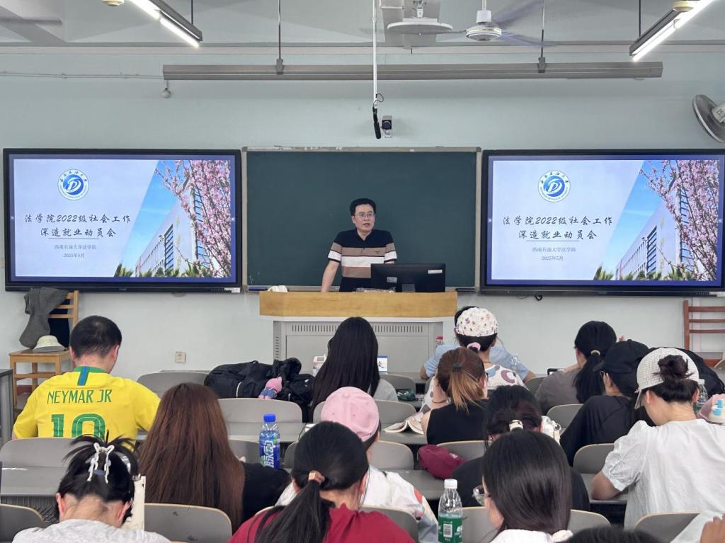 2025年5月21日,法學院2026屆社會工作畢業生深造就業動員大會在思學樓A314正式舉行。本次大會以“明確目標、精準發力、成就未來”為主題,旨在幫助2026屆社會工作畢業生認清當前深造與就業形勢,科學規劃發展路徑。法學院黨委副書記、紀委書記于百江和副院長周炎炎、輔導員邵梧梟和2026屆社會工作畢業生參加。