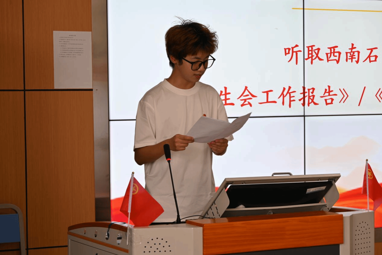 學生會代表趙析宣讀《西南石油大學法學院學生會工作報告》
