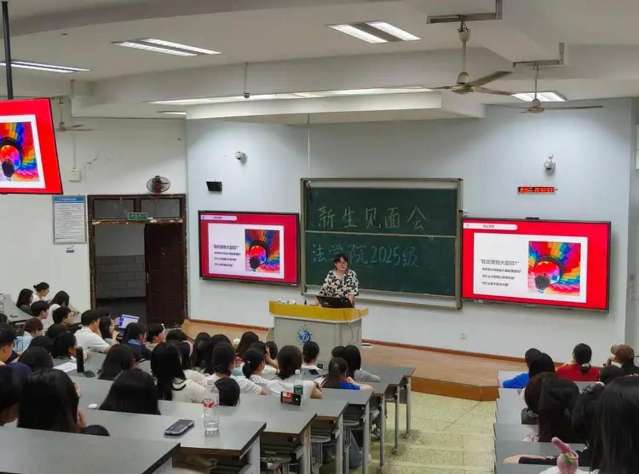 法學院2025級本科生專職輔導員楊依天老師用“秩序、安全、成長”三個關鍵詞,為新生們介紹了大學生活的日常點滴。從校園請假流程的規范說明,到宿舍生活的注意事項,再到校園安全的重要提醒以及心理健康的關注要點,楊老師的講解全面且實用,讓新生們對即將展開的校園生活有了清晰認知,也感受到學院對他們生活關懷的無微不至。