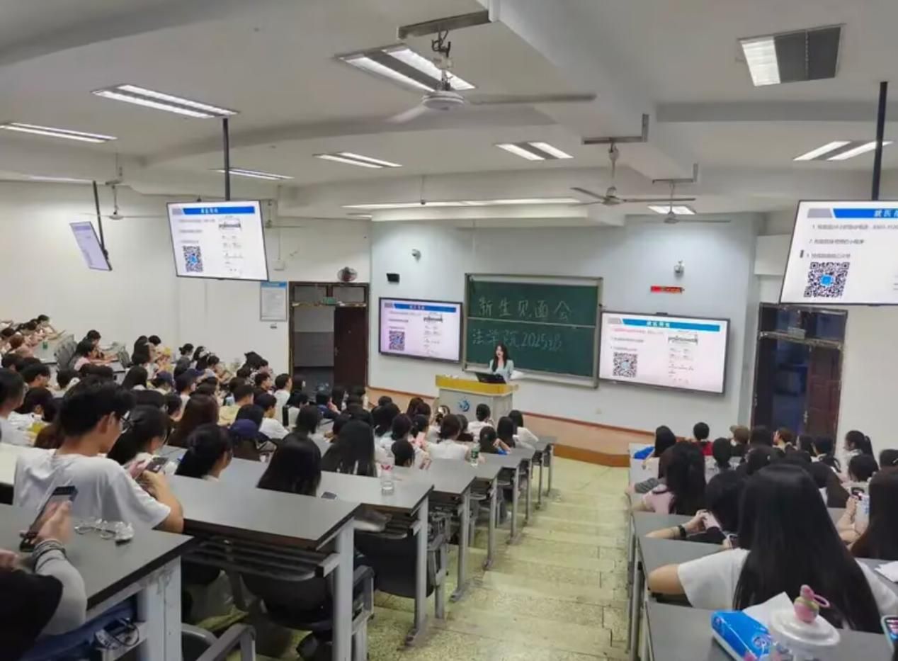 隨后,兼職輔導員劉書英老師聚焦“學業航道”,就法學和社會工作專業的學業發展情況進行深入闡述。劉老師詳細解讀了專業培養方案,讓新生們明晰大學四年的學習路徑;講解推免研究生政策,為有深造意向的同學提供明確指引;介紹轉專業相關事宜,給予了同學們更多選擇的信息參考,助力他們在專業學習上找準方向。