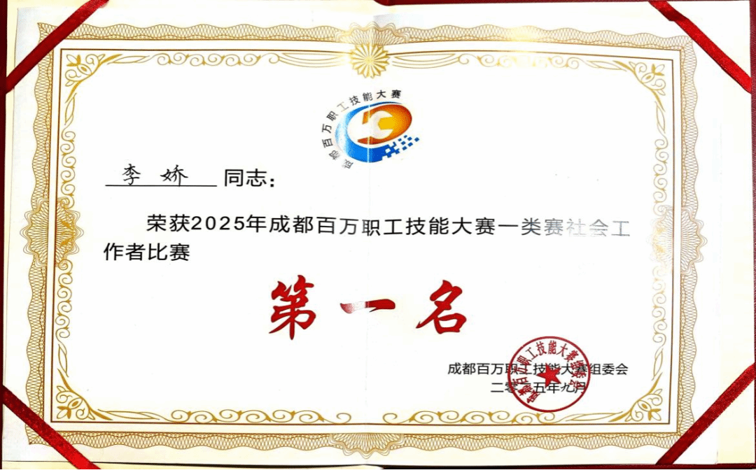 近日,“2025年成都百萬職工技能大賽——成都市第二屆社會工作者職業(yè)技能比賽”在成都市錦江區(qū)望江賓館圓滿落幕。本次大賽由四川省總工會、中共四川省委社會工作部指導,成都市總工會、中共成都市委社會工作部、成都市衛(wèi)生健康委員會、成都市錦江區(qū)人民政府聯(lián)合主辦,旨在為社會工作者搭建技能展示與切磋交流的高水平平臺。經(jīng)過與來自全市各級工會、社會工作部門的504名優(yōu)秀選手的激烈角逐,我院2022屆社會工作專業(yè)碩士畢業(yè)生李嬌憑借扎實的理論功底、精湛的實務技能和出色的現(xiàn)場表現(xiàn),在決賽中力壓群雄,以總分第一名的優(yōu)異成績斬獲大賽一等獎。本屆賽事一等獎僅設一名,李嬌校友的奪魁,充分展現(xiàn)了我院畢業(yè)生的卓越風采與專業(yè)實力。
