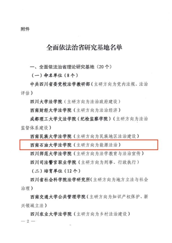 近日,中共四川省委全面依法治省委員會辦公室正式印發《關于設立第一批全面依法治省研究基地的通知》,決定設立第一批全面依法治省理論研究基地8個、培育單位12個,設立第一批全面依法治省實踐研究基地11個,培育單位10個。經自主申報、嚴格評審,西南石油大學法學院成功入選四川省首批全面依法治省理論研究基地,主研方向為“能源法治”。