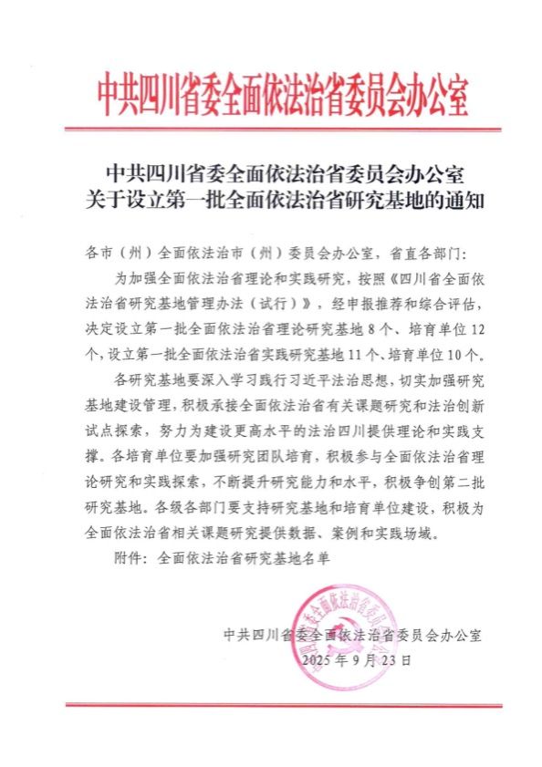 本次入選全省首批全面依法治省理論研究基地,彰顯了學院在能源法學研究方面的實力,也充分肯定學院在服務四川全面依法治省的貢獻。