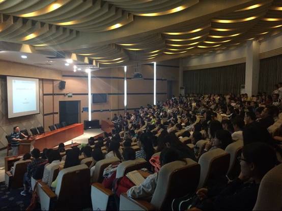 7:10分,講座正式開始,秦鵬教授親切地向現場同學們及老師們問好,隨后引出了“循環經濟”、“環境公民”等社會新名詞,并從環境公民的意涵、環境公民的要素闡釋、環境公民的義務規范三個方面作了講解。他強調,擁有公民身份即意味著履行公民義務,不能一味享受權利。他還大量援引生活中的點滴實例,提出“從小行為完成社會環境保護的大進步”的觀點,并反復強調我們作為“環境公民”就要“煥發環境美德,擔負環境公民應有的責任與義務”。秦教授還指出,我國《循環經濟促進法》立法過程的艱難暴露出諸多社會、政治問題,強調在不斷發展的時代里應更要建制實體法,而相對于我國的現狀,許多發達國家早已提出“循環經濟”的概念,呼吁大家節制對天然資源的浪費,引導學生重視及思考能源儲備與利用對國家發展的重要性。