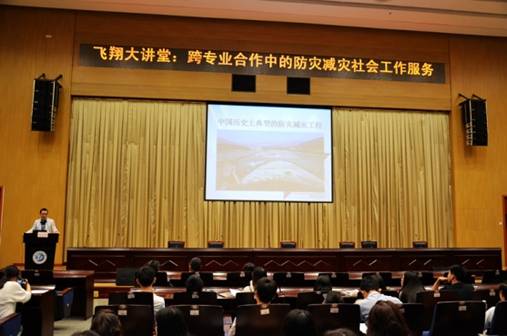 2016年5月10日晚上七點半,我院與校團委、科研處共同舉辦了本期飛翔大講堂——“跨專業合作中的防災減災社會工作服務”。主講人為來自香港理工大學應用社會科學系副教授,博士生導師沈文偉先生。我院黨委書記蘭立平協同新都民政局機關書記陳明珍、新都區委綜治辦副主任李鱗、新都區新中社區書記羅清等人悉數到場。