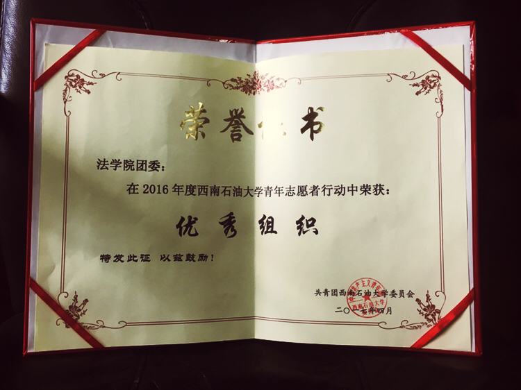 圖一 我院團委在2016年青年志愿者行動中榮獲優秀組織