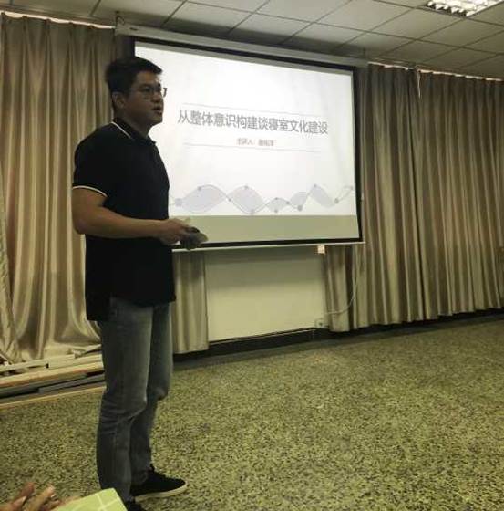 材料院輔導員唐銘澤從整體意識構建來談寢室文化建設,向大家介紹了整體意識的含義,整體意識在寢室建設中的作用,分享了材料院在提高學生整體意識,加強寢室室風建設方面的經驗做法。最后,他從“孕育崇善尚美的道德風尚”、“形成團結友愛的互助風氣”、“創建溫馨舒適的寢室環境”等環節向大家講述了大一整體意識的構建程序。