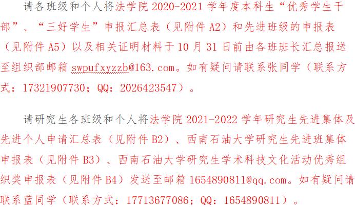 三好學(xué)生、優(yōu)秀學(xué)生干部須執(zhí)行《西南石油大學(xué)本科生先進(jìn)個(gè)人和先進(jìn)集體評(píng)選表彰辦法》(西南石大學(xué)〔2021〕50號(hào))(詳見2021版《學(xué)生手冊(cè)》)規(guī)定,并通過“學(xué)生工作信息化系統(tǒng)”進(jìn)行評(píng)選,詳細(xì)流程與使用說明見附件A3。(暫時(shí)先不填寫,系統(tǒng)填寫時(shí)間將另行通知)