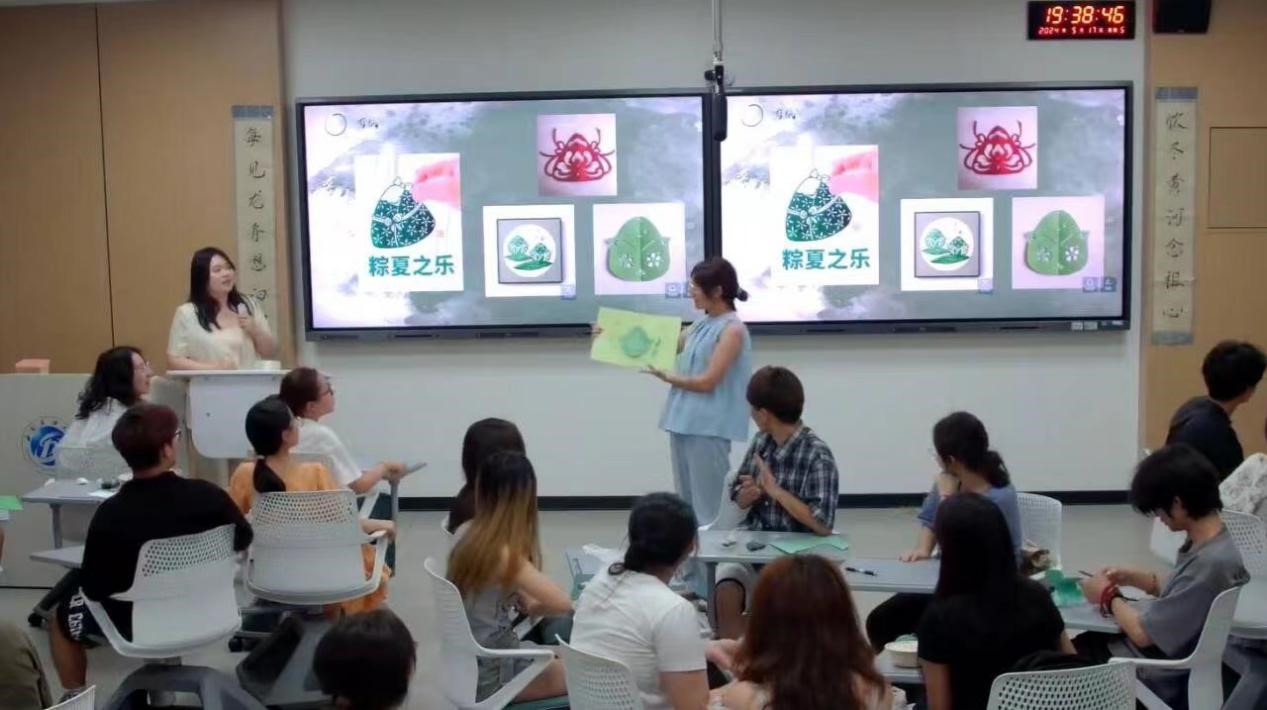 本次主題班會分為三個部分:走近端午、戲游端午和分享端午。由第一部分走近端午啟篇,有關端午節的歷史淵源與習俗的問題,充分引發了同學們的興趣與思考,而在場同學們則積極舉手搶答。進入戲游端午部分,同學們體驗了包粽子、剪紙等中國傳統習俗與技藝,在手工互動過程中,各組同學通力合作、集思廣益,創造出了獨樹一幟的作品,手工環節結束后,雷婷老師帶領著同學們進行趣味搶答環節,同學們踴躍回答,現場氣氛活躍。這一部分不僅鍛煉了同學們的創造能力,還讓在場同學了解了端午相關文化知識。