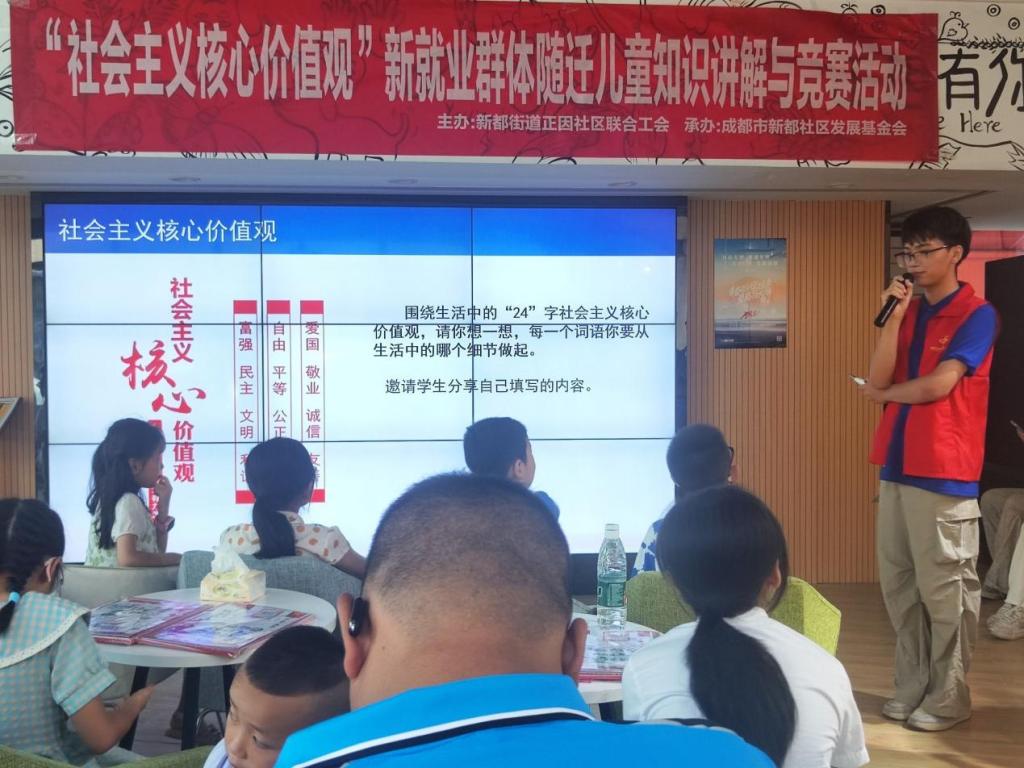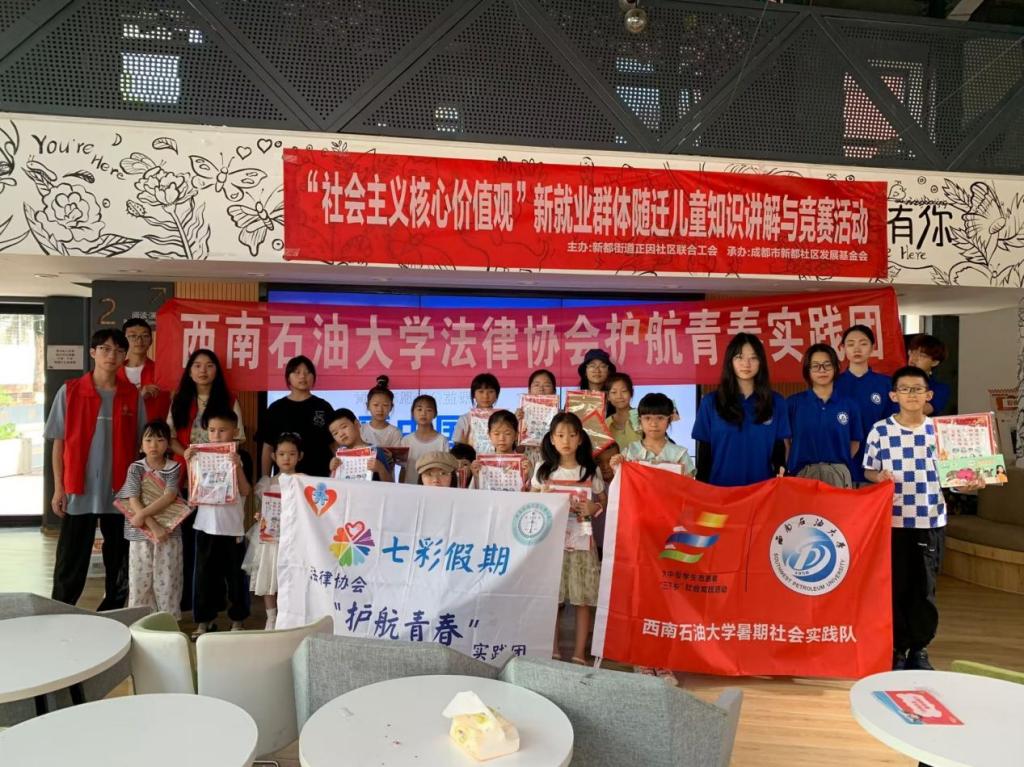 為帶領新就業群體隨遷兒童學習社會主義核心價值觀,扣好人生第一顆扣子。7月11日上午,西南石油大學法律協會“護航青春”實踐團在新都區蓉客e家會議廳內精心策劃與組織了以“社會主義核心價值觀的力量”為主題的知識宣講與競賽活動,通過藝術學習和競賽活動的形式讓兒童深刻理解并踐行社會主義核心價值觀。