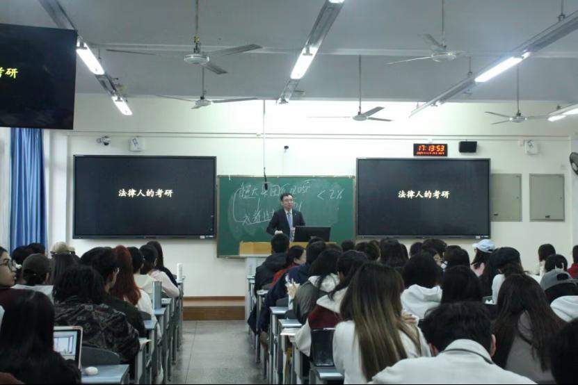 講座中,劉老師圍繞當前的就業形勢、法科生面臨的考研狀況、法考與考研的兼容性,以及如何科學備考四個主題展開講解。他詳細分析了法考和考研的培養方向、職業規劃等基本情況,探討了如何在考研與法考之間找到平衡,如何高效備考,以及選擇考研院校的策略。為即將面臨法考和考研的同學提供了寶貴的建議和指導,幫助同學們全面了解各類考試的異同點。劉老師還指出要根據各知識點在考試中的占比以及特點,以及如何科學高效的制定備考方案。在答疑交流環節,同學們積極提問,劉老師耐心解答,現場氛圍輕松活躍,同學們眼神中充滿了對法律職業道路的堅定與憧憬。