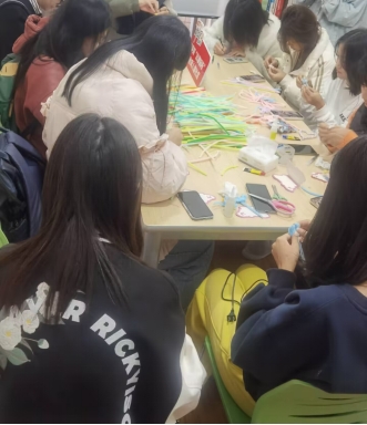 活動伊始,參與同學在主持人的引導下在便簽紙上寫下自己近期的情緒及由此產生的制作扭扭棒的奇思妙想,并與周圍同學相互分享。其后,主持人向參與同學展示扭扭棒基本制作方法與技巧后,同學們便可以開始根據自己的興趣和創意進行發散創作。有的同學創作了可愛的太陽花手環,有的同學做了個性化的小人物件。這些作品的背后所蘊含的不只是創作,更是無數個心靈的碰撞。其中潛藏和蘊含的是同學們近期的情緒,或是欣喜,或是迷茫,又亦或是焦慮……在創作的過程中,這些情緒都被逐漸消解在創作的過程中。接納后的釋然,消解后的平靜,思考中的冥想,一切在扭扭棒的制作過程中被激發、被看見、被覺察、被關照。