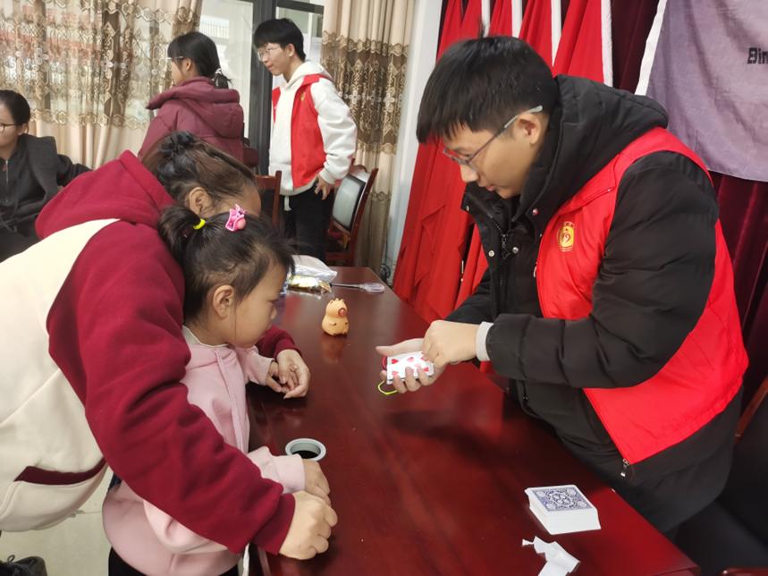 緊隨其后便是今日重點——魔術(shù)教學(xué),通過“皮筋穿透術(shù)”“國王電梯”“會跑的撲克牌”等系列簡化版的趣味魔術(shù)教學(xué)讓孩子們深刻感受到魔術(shù)的魅力,激發(fā)他們對魔術(shù)的興趣。在志愿者的協(xié)助下,孩子們分組合作,共同學(xué)習(xí)和練習(xí)魔術(shù)技巧,在豐富個性化能力的同時也促進其團隊協(xié)作能力的提高,讓他們在魔術(shù)的世界里找到樂趣和創(chuàng)造力。活動漸進尾聲,孩子們每個人上臺分享今日活動感受,溫情彌漫,暖意融融。