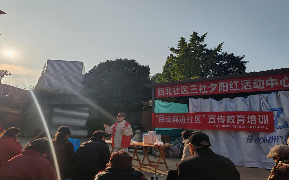 為進一步增強社區居民的法律意識,推動法治社會建設,法學院社工2024級第一團支部的同學們于2024年11月29日在桂湖街道西北社區開展了“民法典宣講進社區”活動,通過宣講與互動,讓居民們在輕松愉悅又日常的對話參與中學習法律知識。