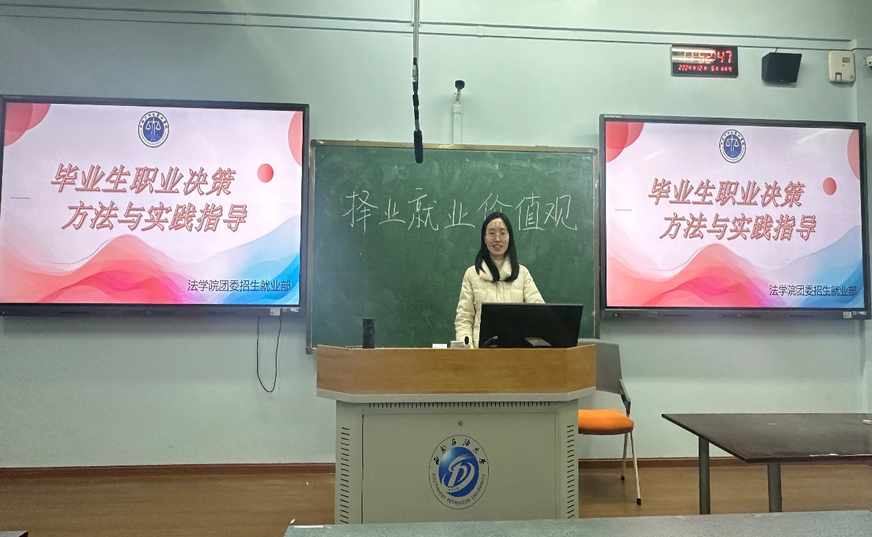 為了幫助法學院即將畢業的學生們更好地應對職業選擇的困惑,科學地做出職業決。11月28日,法學院在博學樓A301成功舉辦了生涯嘉年華系列講座之畢業生職業決策方法與實踐指導講座,邀請了2024級輔導員肖丹老師作為主講人,吸引了眾多法學院即將畢業的同學前來參與。