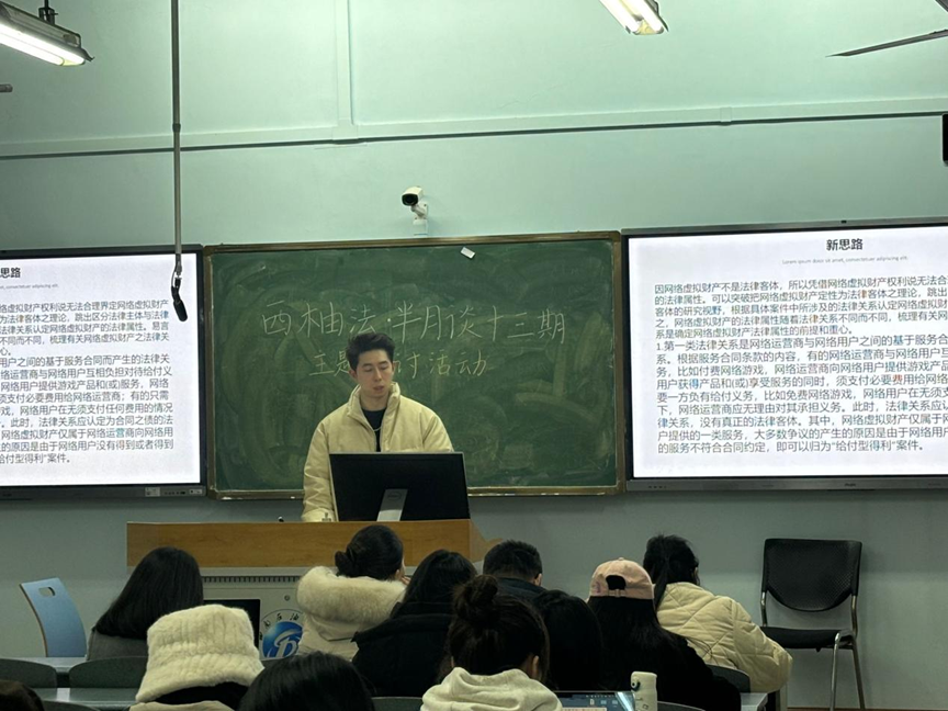 隨著互聯(lián)網(wǎng)技術(shù)的迅猛發(fā)展,網(wǎng)絡(luò)虛擬財產(chǎn)已成為現(xiàn)代生活中不可或缺的一部分。2024年12月26日晚,由西南石油大學(xué)法學(xué)院主辦、西南石油大學(xué)法學(xué)院研究生分會承辦的主題為“網(wǎng)絡(luò)虛擬財產(chǎn)”的第十三期“西柚法·半月談”于博學(xué)樓A502教室順利舉行。六位同學(xué)作為匯報人以“網(wǎng)絡(luò)虛擬財產(chǎn)”為主題展開研討匯報,并且邀請了陳戀、吳曉敏、宋旭平三位老師作為嘉賓與在場同學(xué)進行交流。