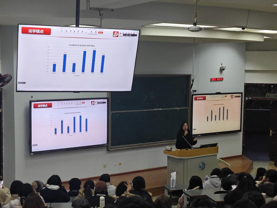 會議伊始,肖丹老師先做了第1學期的學情分析,結合法學、社會工作兩個專業的績點進行橫向和縱向的數據分析,幫助同學們找到差距,向年級內優秀的榜樣看齊。肖老師還結合績點,再次跟同學們解讀了學校畢業和授位的標準和要求,引導后進生看到努力的方向。
