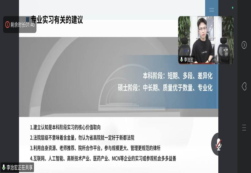 分享會上,李治宏學長針對不同學業階段給出實用建議。本科階段實習應秉持短期、多段、差異化原則,建立認知是核心價值,鼓勵同學們利用資源參與大律所實習,把握新興產業實習機會;碩士階段實習強調中長期、重質量專業化。