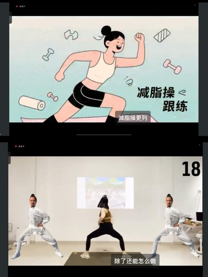 本次直播邀請了法學院舞蹈隊成員閆昭慧為大家展示正確的減脂操動作。她從熱身運動入手,示范了頸部繞環、肩部拉伸、弓步壓腿等一系列標準動作。帶來了一套針對大學生日常場景設計的高效減脂運動組合,無論是簡單易學的開合跳、后踢腿,還是具有一定挑戰性的弓步跳、胯下擊掌,她都標準認真地示范每一個動作,提醒同學們可能出現的錯誤姿勢。