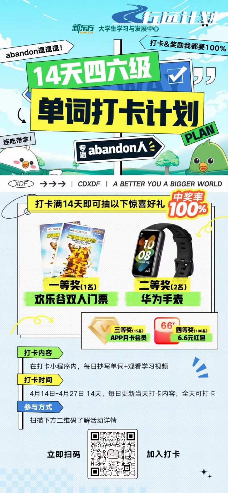 為提升法學院同學們的英語能力,激發備考熱情,助力學子夯實語言基礎、勇攀學業高峰,法學院學習部于4月14日組織舉辦為期14天的“春啟新程”四六級攻堅之旅活動,通過每日打卡獲取獎勵的形式激勵同學們認真備考。