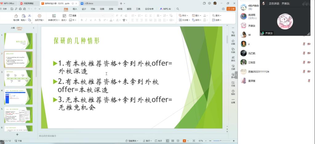 會上邀請了成功推免至中南財經政法大學的齊崇汝同學進行經驗分享。齊崇汝同學綜合成績優異,具有豐富的推免實戰經驗。在分享中,齊崇汝詳細介紹了推免的全流程,從前期準備、夏令營申請,到預推免的注意事項等,毫無保留地分享了自己的寶貴經驗。她強調,扎實的專業知識是基礎,日常學習中要注重構建完善的知識體系,提升專業素養。同時,英語能力在推免過程中也至關重要,無論是文書撰寫還是面試交流,都需要良好的英語水平。此外,她還分享了在面試中的技巧,如如何清晰表達觀點、展現個人優勢等。