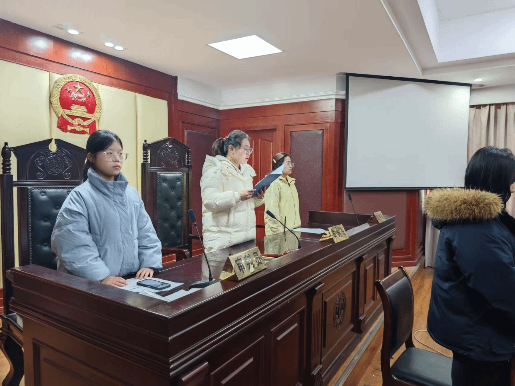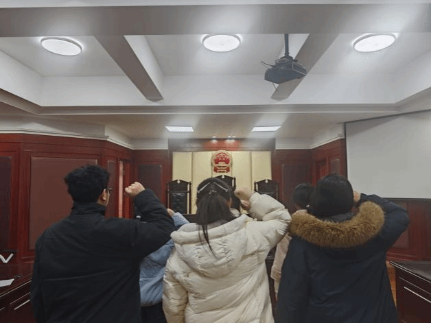 班會以莊嚴的憲法宣誓拉開帷幕,全體學生右手握拳,在領誓人帶領下宣讀誓詞,鏗鏘誓言傳遞出對憲法的尊崇。隨后的模擬法庭環節中,學生們分別扮演法官、檢察官、律師等角色,還原庭審流程,沉浸式體驗司法實踐。楊梓因老師結合案例開展法制教育,剖析法條內涵。