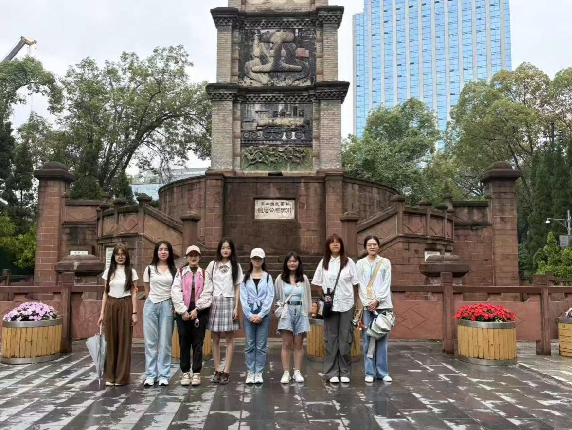 活動伊始,實踐隊在人民公園門口集合,隊長劉姝君向隊員們介紹了本次研學的重點內容。在參觀過程中,隊員們重點考察了人民公園的標志性建筑——辛亥秋保路死事紀念碑。紀念碑矗立在公園中央,象征著無數革命先烈為國家和人民的犧牲與奉獻。實踐團成員們在紀念碑前莊嚴肅立,向先烈們表達崇高的敬意。