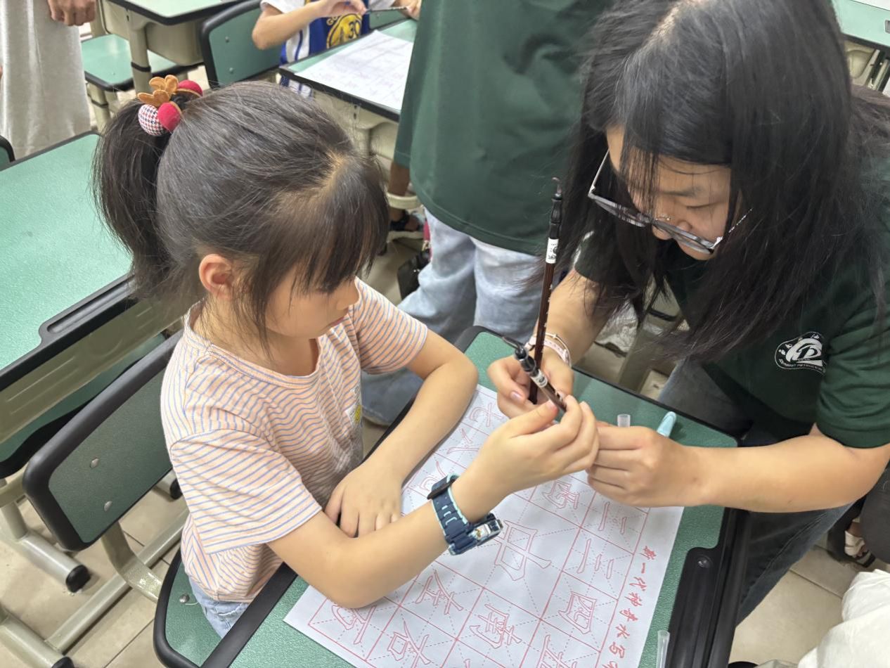 實踐隊以“漢字起源”為引,通過倉頡造字的故事點燃孩子們對文字的好奇。在書法體驗環節,隊員們手把手教學,引導孩子們執筆揮毫。“豎直筆桿,象征我們做人要正直;提按轉折,寓意厚積薄發、未來可期。”一橫一豎間,墨香浸潤童心;一提一按中,文化自信悄然生根。