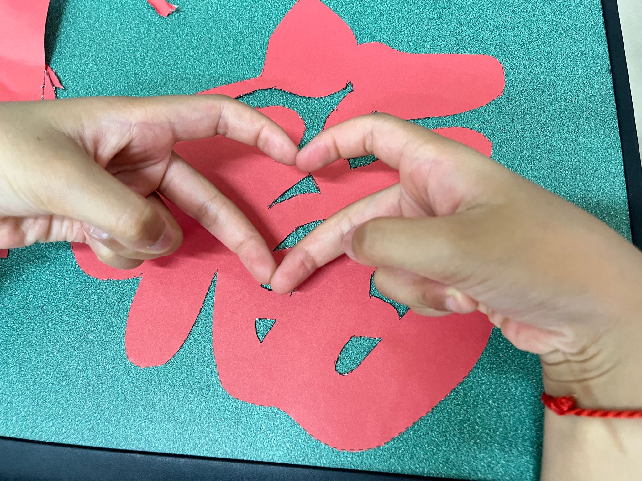 紅紙翻飛,剪刀輕舞。在實踐隊員指導下,靈動的“福”字與錦鯉躍然紙上。“福”是綿延千年的祝福,“魚”是年年有余的期盼,孩子們高舉作品合影,笑臉與剪紙相映生輝。這不僅是非遺技藝的傳承,更是人民對美好生活向往的生動表達。