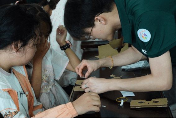 制作環節中,隊員們穿梭在孩子中間,耐心指導、及時答疑,幫助大家解決制作中遇到的困難。孩子們在動手實踐中不僅鍛煉了操作能力,也在與大學生志愿者們的交流中,逐漸習慣使用普通話進行表達和提問。當一個又一個簡易而精致的VR眼鏡在他們手中誕生,孩子們興奮地戴上眼鏡,探索虛擬世界的那一刻,歡聲笑語中洋溢著對科技的好奇與對溝通的自信。
